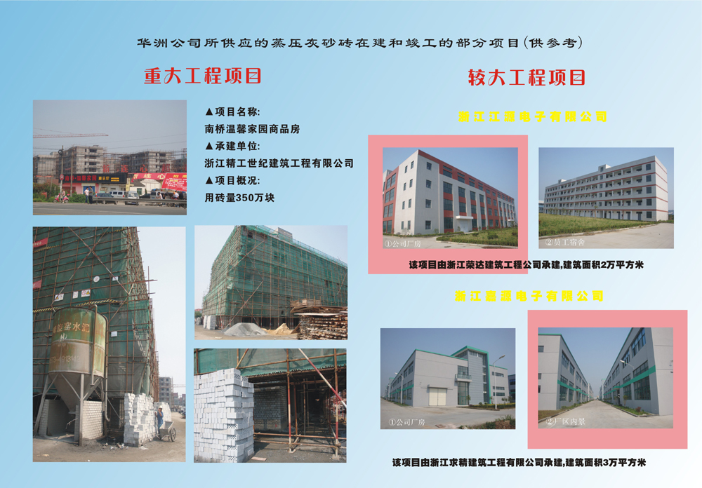 华洲公司所生产的蒸压灰砂砖、蒸压空心砖产品经过180度高温高压养护下制成,产品质量已经通过国家建筑材料工业局硅酸盐制品的质量监督检查中心和浙江省建材产品质量检验站测试,符合国家GB11945-1999、JC/T637-1996标准,并获得嘉兴市技术监督局颁发的产品合格证书。该产品有无收缩、抗压、抗冻、具有节约粘土、不破化耕地、节能利废、降低能耗和资源综合利用等特点,并凝聚着轻质、高强、防火、无毒、无辐射性、保温隔热好等优点,受到了广大用户单位的一致好评。