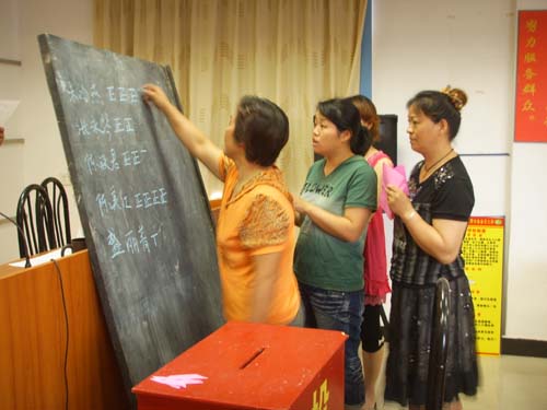 随后,由上一届妇代会主任陈美红作三年工作报告,她还提出了下一届的工作目标。张永琴宣读了《妇代会选举办法》(草案),大家鼓掌一致通过了该办法和监票人、计票人后,由村党总支书记蒋富根介绍了4位候选人的基本情况,村党总支副书记、村委会主任盛玉华、村党总支副书记盛永章、村党总支委员周建忠一起参加妇代会的换届会议。
