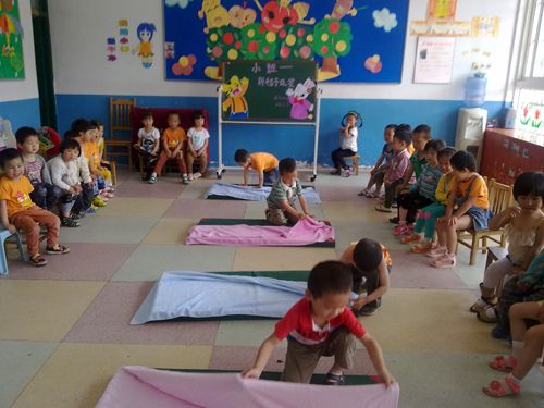 随着裁判员的一声令响,第一组的小朋友们马上开始,他们的表情轻松愉快,叠毯子的动作干净利索。一旁观战的小观众们大声地为选手们呐喊助威,加油声此起彼伏。不一会儿,选手们已经叠好毯子,不仅叠的快,而且叠的很整齐。接下来的三组小选手们更是一组比一组棒,一组比一组快,激烈的比赛场面感染了在场的每一个幼儿和老师。孩子们为同伴出色的表现而骄傲,老师为孩子们的自信与能力而自豪! 叠毯子比赛不仅让孩子们感受了比赛的兴奋、激动、喜悦,激发了孩子们勇于争先的进取心,促进孩子自我服务的意识,更加激发了孩子们“自己的事情自己做”的自信心!以及他们自理能力的提高。