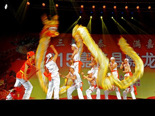 3月5日晚上,“三羊开泰·福满嘉善”2015年嘉善县舞龙展演在嘉善体育馆举办。在喜庆欢腾的音乐声中,来自各个乡镇(街道)的11支舞龙队准备在舞台大显身手。我村舞龙队精心改编的《龙腾盛世》再次参加展演。 据了解,经过改编的《龙腾盛世》相较去年,内容更丰富、难度更高、节奏更紧凑。10位年轻而充满激情的舞龙队员,伴随着音乐操控“长龙”游动、跳跃、翻滚。精心设计的“大横八字花”、“站腿舞龙”、“绕身舞龙”等,更是赢得了台下观众阵阵掌声。