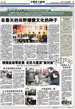 3月19日下午,“浙江在线”网上现场直播“农民‘种文化’百村赛互动”节目。下午一时,我村电子阅览室内来了许多闻讯赶来的年轻人,到下午二时已经聚集了几十人,其中有团员、党员、组长、企业老板,还有一些村民,大家都围在电脑面前观看浙江在线农民“种文化”百村赛互动直播。我村还在村会议室设了一个互动点,大家通过大屏幕积极地参与到活动中。在仔细聆听节目主持人和现场嘉宾对我省各地的农村、农民如何“种文化”的看法和建议等,大家还就“种文化”的一些问题进行了网上留言提问。嘉善电视台、浙江日报两家媒体还对此采访了几位村民。