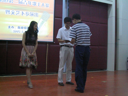 在比赛过程中,不仅有好听的流行歌曲,还有慷慨激昂的革命歌曲,整个会场上飘荡着青春气息。经过激烈的角逐,来自罗星阁宾馆的何广岭以一曲《精忠报国》征服了所有的评委和观众,捧走了此次比赛的桂冠,宋赟和周悦荣获二等奖,刘晶和沈菲菲荣获三等奖。