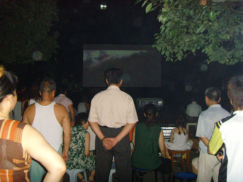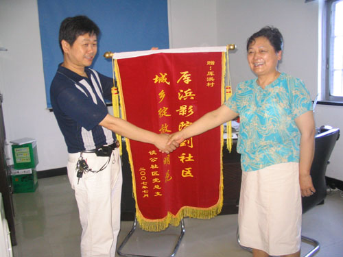 6月29日晚上,我村周建忠、陈美红、陈铁君、朱金堂、张明荣等几位同志将数码电影放映设备搬到谈公社区,在解放三村为居民们播放了电影《太行山上》。宽银幕和立体声的效果让居民们耳目一新。为了表示感谢,7月11日上午,谈公社区主任王桂英给我村送来锦旗,上面写着“厍浜电影到社区 城乡绽放文明花”。