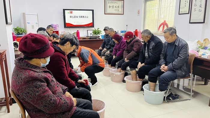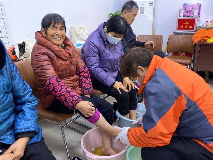 备水烧水、药材包、泡脚桶、一次性塑料袋等准备完毕,老人们分坐两排,大家一起享受悠闲时光,脸上洋溢着幸福满足的笑容。“先泡、再磨、后剪”,娴熟的手艺和热情周到的服务,赢得了老人们的赞誉,在这个冬天脚暖心更暖。