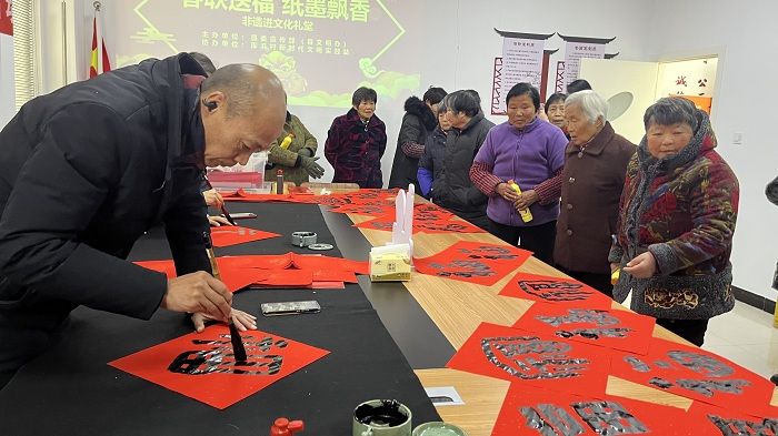 1月10日上午,厍浜村开展“春联送福 纸墨飘香”非遗进文化礼堂活动,由罗星成校两位书法老师现场挥毫泼墨,倾情书写,一幅幅寓意吉祥的春联,一张张喜气洋洋的“福”字,化作最真挚的新春祝福,让大家提前感受到了浓浓的年味。