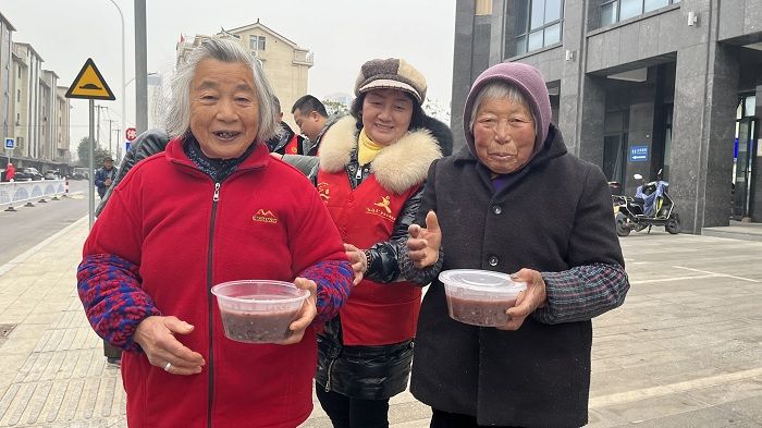 这一碗粥出自厍浜村的志愿者,提前一天就将食材浸泡、清洗、熬煮……随着大勺不停地搅拌,将暖心厚意糅进了传统的习俗里。村民从志愿者手中接过香甜软糯的腊八粥,暖手也暖心,更有不少村民发挥创意,带着自家的瓷碗、饭盒、小锅、不锈钢盆等容器,也为家人带去腊八节的节日氛围。