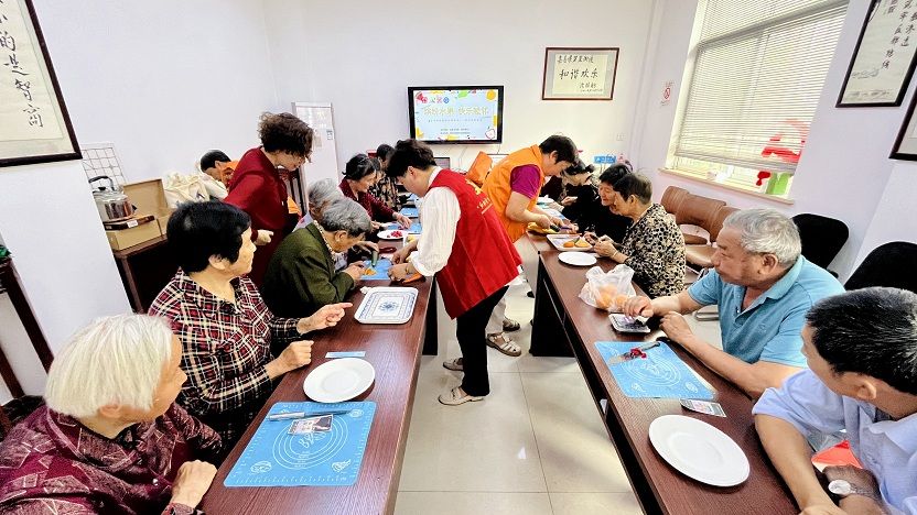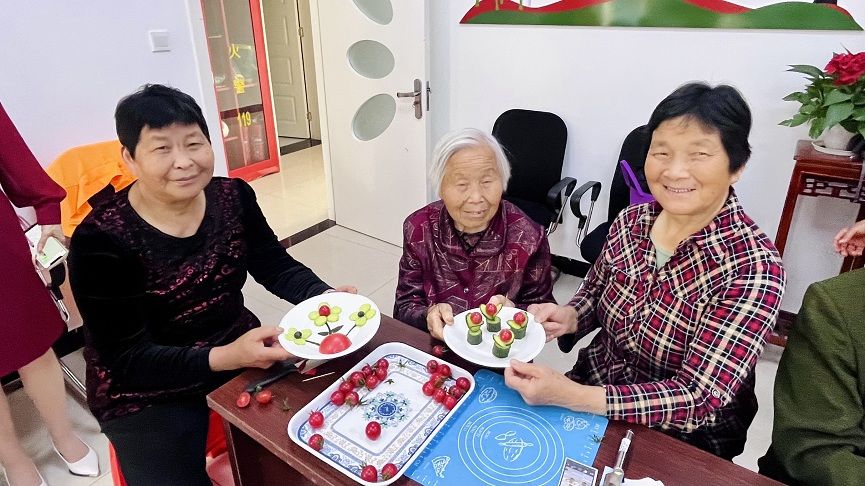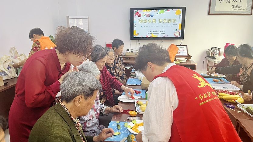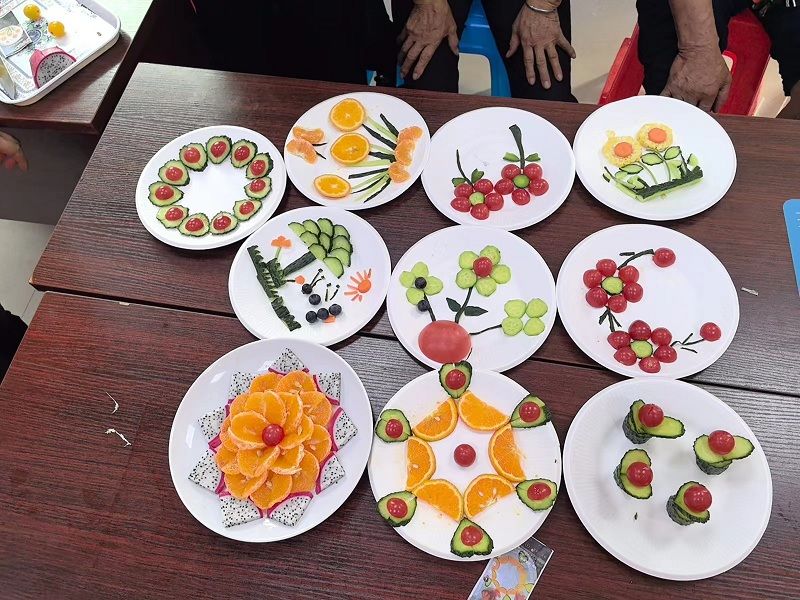 活动现场犹如一个“水果蔬菜加工厂”,小番茄、黄瓜、火龙果、西瓜、橘子等等,经过老人们的巧手精雕细琢,变成了一幅幅或有趣、或精美的“艺术品”,有盛放的花朵、有翩跹的蝴蝶、还有生动的蚂蚁等,现场欢声笑语不断,大家互相品评、点赞他人的作品,一片合乐且和谐的氛围。