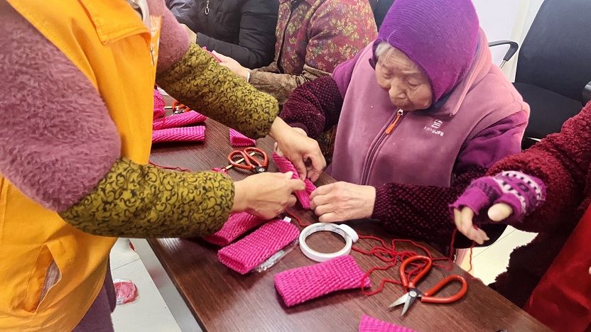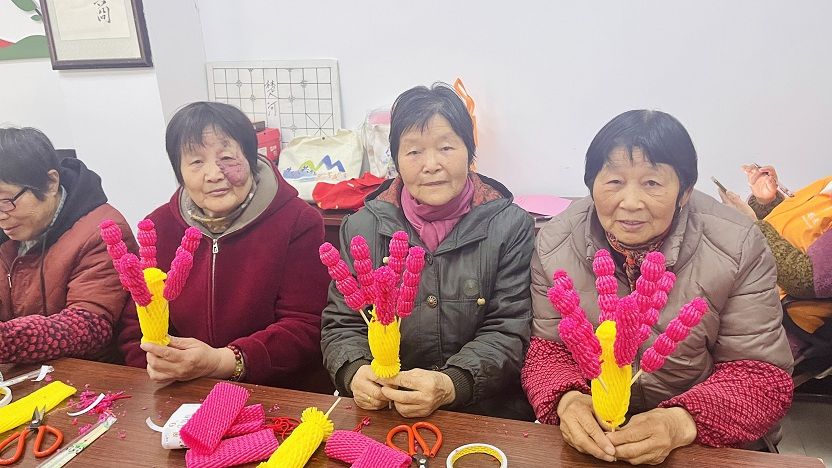 活动现场,老人们围坐在桌子旁,桌上整齐地摆放着五颜六色的水果泡沫网袋、剪刀、毛线、筷子等材料,一捆一扎,简单的几个小步骤,质地柔软、颜色鲜艳的水果泡沫网套就像被施展了“甜蜜魔法”,变废为宝成为一串承载着许多人的童年回忆的“糖葫芦”。老人们玩得不亦乐乎,黄色的底座上被插满了红彤彤的糖葫芦,“好久没有这么开心地动手做东西了,看看这些糖葫芦,心里别提多有成就感了。”村民陈阿姨 开心地说道。