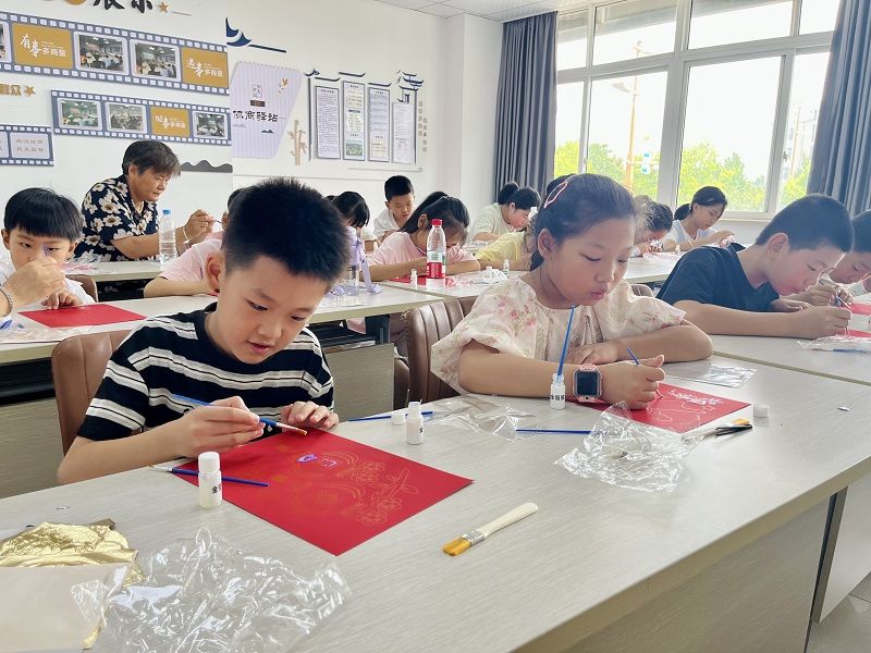 讲座结束后,备受期待的非遗烧箔画制作环节正式开始。志愿者们早已准备好制作所需的材料和工具,并耐心地向孩子们讲解烧箔画的历史渊源、制作技巧和注意事项。孩子们听得认真,看得仔细,跃跃欲试。在志愿者的悉心指导下,他们用胶水绘出五角星、长城、和平鸽等具有浓厚爱国寓意的元素。孩子们小心翼翼地用镊子夹起金箔,细致地粘贴,专注的神情里满是对革命先烈的崇敬和对祖国的热爱。一张张精美的烧箔画在孩子们的指尖逐渐成型,不仅展现了他们的动手能力,更让红色记忆通过传统工艺得到了生动传承。
