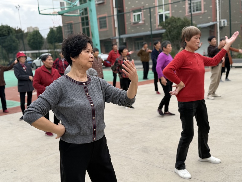 随着音乐响起,老人们在志愿者的带领下翩翩起舞。村民钟阿姨动作舒展,脸上满是笑容:“以前天冷了就窝家里看电视,现在跟着大伙跳舞,还学了节气知识,浑身都暖和!” 现场,有的老人虽动作稍慢,却格外认真,同伴们互相提醒姿势、鼓劲加油,广场上的笑声与乐曲声交织,暖意十足。