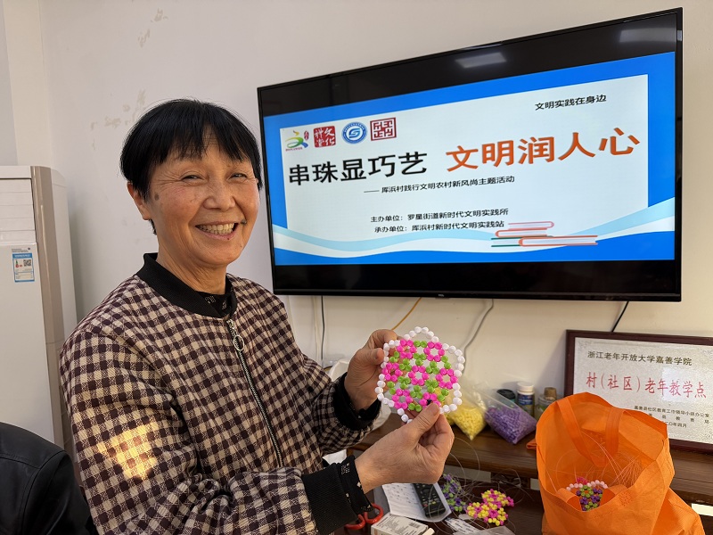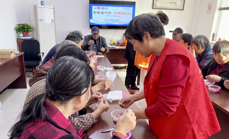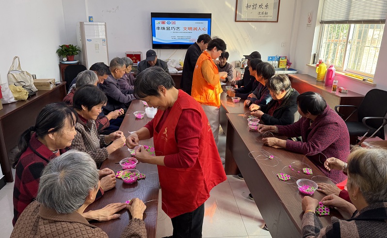 11月14日,厍浜村文化礼堂开展“串珠显巧艺 文明润人心”手工活动,20余名村民欢聚一堂,用彩色串珠编织杯垫,在指尖巧艺中感悟文明内涵,让文明理念落地生根。