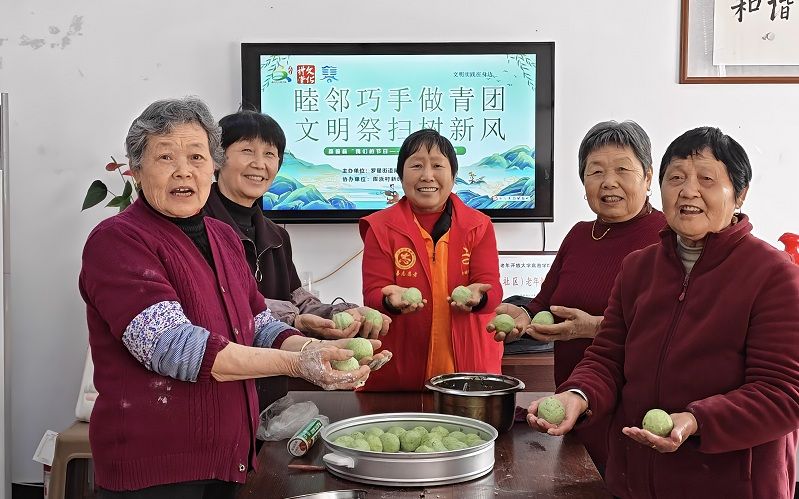 青团蒸熟后,村民们围坐在一起,共同品尝鲜香的咸菜青团,分享节日喜悦。大家在品尝美食的同时,进一步交流文明祭扫心得,纷纷表示会自觉践行文明新风,用实际行动守护绿色家园。此次活动,不仅以传统美食为纽带,拉近了邻里距离,筑牢了睦邻友好的厍浜村根基,更让移风易俗理念融入日常,引导村民以文明方式追思先人。
