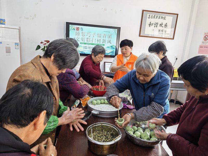 活动现场暖意融融,青团制作环节拉开序幕。志愿者提前备好新鲜艾草、糯米粉、咸菜馅料等食材,志愿者细致讲解青团的民俗寓意与制作步骤,手把手带领村民揉面、包馅、塑形。邻里之间互帮互助、配合默契,大家围坐在一起,边动手边唠家常,欢声笑语萦绕全场。翠绿软糯的面团裹上鲜香的咸菜馅料,一个个圆润饱满的青团陆续成型,满屋飘散着艾草的清香与食材的鲜香,尽显浓浓的邻里情谊。