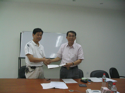 7月27日下午,我村党总支书记蒋富根、村主任盛永章,魏塘镇工业园区招商部部长傅卫明,日本TKD株式会社董事长片冈富士男在嘉丰机电有限公司圆满签订投资办厂意向合同。 双方对合同未涉及的问题进行了再次谈判,最后以补充协议的方式达成一致意见,并签订兴办嘉兴信保展机电科技有限公司租赁厂房合同。片冈社长将首付款5万元亲手交给蒋书记手中,并合影留念。日方最后对厂房图纸提出的修改意见将于两个月内做好图纸定稿,并实行招投标,今年春节前完成本项目的施工。