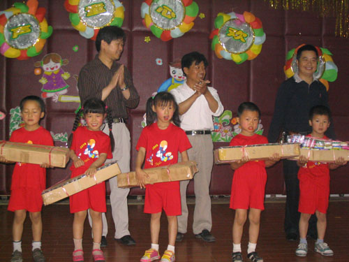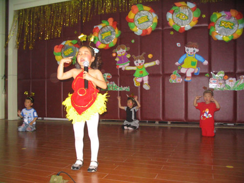 “六一”儿童节在小朋友们的欢笑声中到来,今年是厍浜幼儿园迎来的第六个“六一”儿童节。为此,幼儿园的老师们精心准备了一场“歌声 童心 欢乐”为主题的文艺汇报演出,邀请小朋友和家长们以及关心和支持幼儿园发展的各界领导们一起观看,演出设在文化活动中心影视厅,共安排了八个节目。 演出前,老师们把影视厅外面围满了气球,会场播放的都是儿歌,气氛轻松愉快。在小朋友们的期盼中演出开始了,首先上台的是李颖煌、陶轩等10位小朋友,他们挥着金棍棒为大家表演《猴哥》,他们将手往眼前一摆,瞧那架势还真像孙悟空呢!惹得不少大朋友和小朋友哈哈大笑。《数鸭子》是小班小朋友带来的,1只、2只、3只,哇!好多可爱的小鸭子啊!他们时而挥舞着翅膀,时而翘起小尾巴,可爱至极。幼儿园舞蹈队的小朋友们穿着小军装,举着红旗和枪,为大家献上了舞蹈《都市娃娃兵》。幼儿园的演出也引来了一些家长的参与,这不,汤淑萍的爸爸和姐姐也上台为大家演出了,爸爸吹着口琴,姐姐唱着歌,汤淑萍跳着舞,一家人其乐融融,让人感觉好温馨。演出进行到一半的时候,我村的领导上台为小朋友们送上了礼物和节日的祝福,同时,村党总支书记蒋富根对一直关心和支持幼儿园发展的各界朋友表示感谢,接过礼物后,无论是小朋友代表还是台下的小朋友都显得分外开心。这时,蒋奕天、朱梦娇等8位小朋友上台为大家表演歌舞《小星星》,从他们嘴里唱出来的歌曲是那么的好听,带着可爱和欢笑,在歌声中小朋友代表为到场的领导送上了鲜花。一曲《好日子》将演出推向高潮,钟蝶宇、赵楠等8位小朋友扭起了秧歌,跳起了欢快的舞蹈。带着游泳圈,光着小脚丫,跑来了一群小朋友,原来这是中班小朋友给大家带来舞蹈《小浪花》,虽然舞台上没有金色的沙滩,但是小朋友们却表演的非常投入。 六月是大班小朋友在幼儿园的最后一个月了,他们派代表上台给老师献上了美丽的花朵。随后,他们戴上了博士帽走到台上朗诵了毕业诗,演唱了毕业歌,整台演出在热烈的掌声中落下了帷幕。在散场的时候,每位小朋友都拿到了一份节日礼物。晚上,我村党总支还为小朋友们播放了电影《宝莲灯》。
