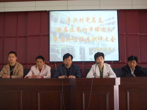 4月28日上午我村召开党员、社长和村民代表会议。主要是对党总支初步候选人进行测评,村党总支书记蒋富根主持会议,会议主要对8名党总支委员初步候选人进行信用度测评,会上,镇党委委员陆芸对此次测评内容作详细说明,并强调了应注意的各类事项,最后,全体人员投票表达自己的意愿。