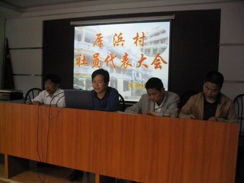 村党总支书记蒋富根主持会议,他说,我村从4月26日选出了新一届的村委会,5月6日下午选出新一届的村党总支成员,今天我们又选出了厍浜村经济合作社组成成员,村经济合作社对外履行村实业公司职能。到今天为止,我们已全部完成了村三套班子及配套组织的选举工作,我代表村全体班子成员感谢大家对我们的信任,我们一定要尽心尽力地做好工作。该这么做我们就这么去做,一分成绩,一份收获,换届刚结束,三年的时间一闪就到,一定要做到自己竟职承诺的诺言,做好自己的工作,主动、热情、服务、公正、公平是我们获得群众信任的根本,我们按照村党总支提出的目标努力的工作,使厍浜村的各项工作走在全镇的前面。他还通报了村班子成员的分工情况,参加代表会议的其他同志有镇换届选举指导组副组长顾玉根,担任过我村二委正职的退休老干部列席了今天的社员代表会议。