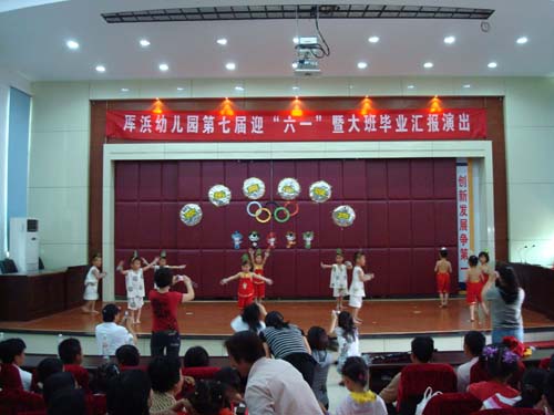 6月1日一大早,幼儿园就彩旗招展,一片欢腾的场面。参加演出的小朋友在家长的带领下,精神奕奕的来到幼儿园进行化妆。今天我们将欢聚在村文化活动中心影视厅,来庆祝我们的节日“六一儿童节”,同时请来了村两副班子领导和家长前来观看。活动在王老师的主持下开始,在舞台上我园小朋友表演了《小小兵》、《小燕子》、《只要妈妈露晓莲》、《雨点莎莎》、《欢乐中国年》、《小松树》、《毕业歌毕业诗》、等7个节目,中间穿插了亲子小游戏和猜谜活动。本次六一活动在一片欢快,愉悦的氛围中顺利开展。