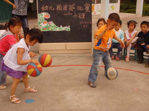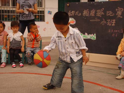 6月13日,厍浜幼儿园小班的小朋友,开展了一场别开生面的拍皮球比赛。当天上午9点正,小(一)班,小(二)班的小朋友,兴高采烈的围坐在操场中间,准备开展拍皮球比赛!只见一个个参赛小队员,随着一声令响,都不停地挥动着自己的小手,皮球顿时在他们手下有节奏的弹跳,围观的小朋友都兴奋地喊着:“加油,加油!”在小朋友地努力下,赛出了一、二、三等奖!这次活动不仅提高了幼儿的操作积极性,而且也初步培养了幼儿的个人荣誉感!起到了很好的活动效果!