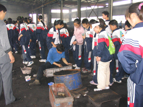 他们此行参观了嘉善县科士达金属制品有限公司、嘉善县合金球铁厂、嘉善县嘉优木业有限公司,虽然有些企业机器声嘈杂,但却丝毫没有影响同学们的参观热情。当他们跨进嘉善县科士达金属制品厂时,正值开炉时刻,铁水从滚烫的炉中倒入器皿中,时而溅起火花,场面十分壮观,在场的同学无不连声感叹,争先恐后地观看。在整个参观过程中,同学们时而相互讨论,时而将自己的疑惑询问工人,有些同学举起了手中的相机,记录下了这一时刻。