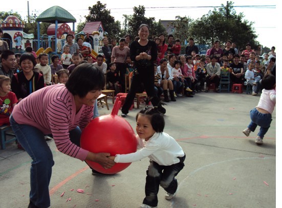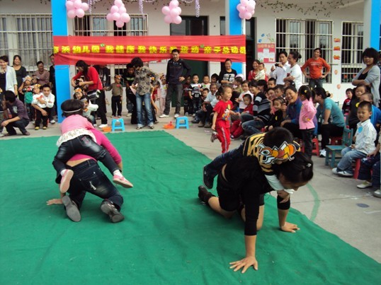 伴随着强而有力的进行曲音乐,小朋友们排着整齐的队伍进场了。亲子总动员在孩子们和爸爸妈妈的“踩气球”活动中拉开序幕,气球被噼噼啪啪的踩破,小朋友的活动热情更加高涨。继而是以班级为单位的亲子游戏项目,家长和孩子们在老师精心设计的亲子游戏中,尽情玩耍。“丢乒乓球”、“拔鸭毛”、“螃蟹运球”、“小蚂蚁背糖果”等游戏趣味横生,家长摇旗呐喊、亲历亲为地参与,更是提高了孩子们活动的兴趣和积极性。在最后的“接力赛”比赛中,大一班、大二班、中班都挑选了十个家庭参加比赛,经过了两轮的激烈角逐,大一班取得了第一的好成绩。操场上传来的一阵阵呐喊声、欢笑声把我们带入了一个儿童世界。在亲子总动员活动中,最让孩子们高兴的是能和爸爸妈妈一起做游戏,而平时忙于工作的家长们也体会到运动对孩子健康和全面发展的重要。