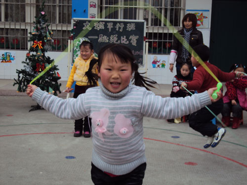 12月28日下午,厍浜幼儿园大一班、大二班的小朋友齐聚在操场上开展跳绳比赛。