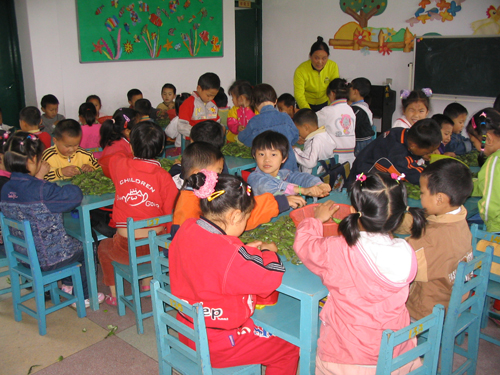 5月12日上午,厍浜幼儿园的小朋友发现在自己的桌子上摆满了豆荚,这是怎么回事呢?原来这里要进行以班级为单位的幼儿技能比赛。