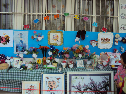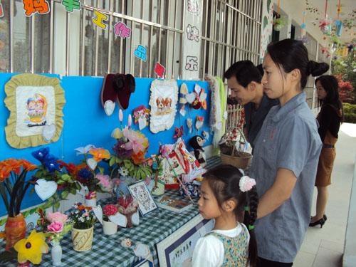 只见在活动展示台上,有漂亮的十字绣扁,有色彩亮丽的袜子花,有创意非凡的竹编篮子,还有形态各异的纸作品,真可谓是精彩纷呈。在这么多的作品中,我园评选出十位妈妈作品,获得了此次活动的优胜奖,特别要指出的是周味雅妈妈的作品最多,也最为精致:她的袜子华编的娇艳欲滴,十字绣针针精致,毛线鞋漂亮大方,给人赏心悦目的感觉!
