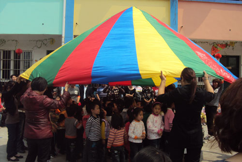 教学活动一结束,孩子们和家长们又在老师的事先精心策划下,来到了操场上,进行了亲子游戏活动。通过游戏,让家长也体验了一把童年时的记忆,同时也增进了家长与孩子间的进一步了解与沟通。