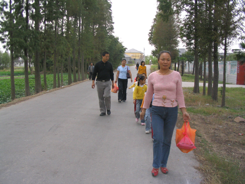 幼儿园老师带了小朋友给老人们的礼物走出园门